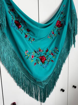 Elegante mantoncillo de flamenca en color verde agua, perfecto para complementar tu traje. - Diseño triangular con bordados florales en tonos rojos y azules. - Flecos largos y abundantes en todo el borde. - Adornado con una puntilla de hilo en el contorno.