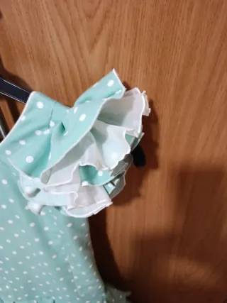 Precioso traje de flamenca para niña con un diseño alegre y lleno de volantes. - Color verde con lunares blancos. - Volantes en mangas y falda. - Ideal para fiestas y eventos flamencos. Precio algo negociable.