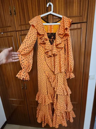 Traje de flamenca hecho por modista, a medida. Yo mido 1'69 cm + tacón. No pesa, tela crespón. - Color naranja con lunares negros. - Mangas acampanadas con volantes. - Cuerpo con escote en V y volantes.