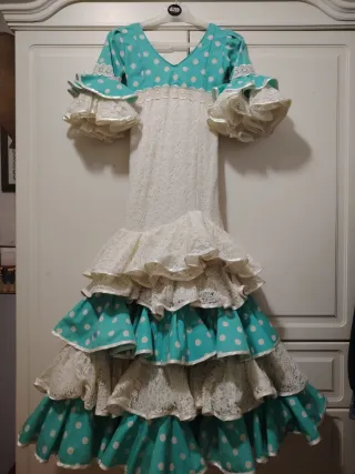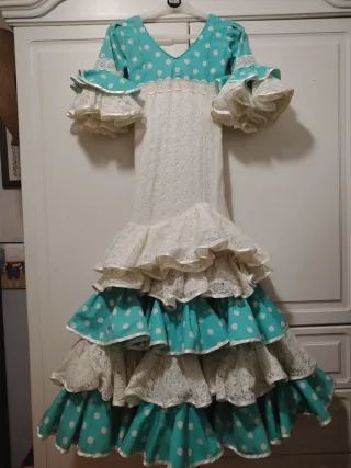 Traje de flamenca talla 8 años de color verde agua con lunares y cuerpo color crema. - Mangas con volantes. - Falda con volantes y encaje blanco. - Detalle de encaje en la cintura. Largo de hombro al suelo 118 CMS Pecho 28 CMS Cadera 31 CMS 4 CMS en casa lado para echarle. En perfecto estado, gran calidad.
