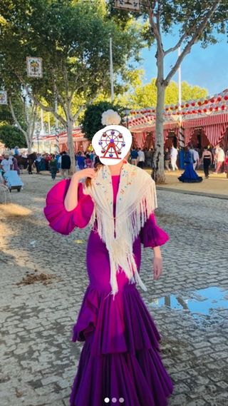 Traje de flamenca de color buganvilla, usado solo dos veces. Un diseño elegante y llamativo. - Mangas con volantes. - Falda con volantes en cascada.