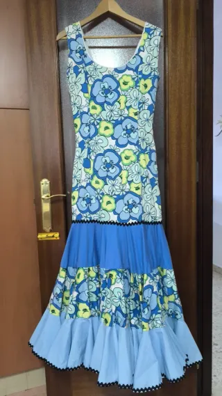Traje de flamenca celeste con lunares. Los volantes tienen bastante vuelo ya que lleva organdil debajo. Confeccionado a mano (medidas en la 2° foto) Manga al codo, tiene bolsillo y tela para sacar. TIENE MANCHAS Y COMO DOS QUEMADOS como se muestra en fotos, aunque al estar entre volantes no se ven. Lo utilizaría como patrón, disfraz o modificarlo a tu gusto. La última foto está generada por IA para mostrar cómo queda la prenda, pero en la galería están las fotos reales del artículo. Precio negociable.