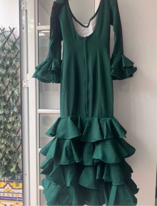 Traje de flamenca de color verde oscuro de la marca El Rocío. - Vestido con cuatro volantes - Mangas hasta el codo con dos volantes - Escote en pico - Detalle hombrerera izquierda con flecos - Bolsillo interior - Se puede sacar casi una talla más . Medidas: (ajustable): pecho 90 cm, cintura 70 cm, cadera 95 cm, largo (de los hombros a los pies) 1.52 m **Altura para 1.60 m, se puede ajustar de largo para mayor o menor estatura **Un uso