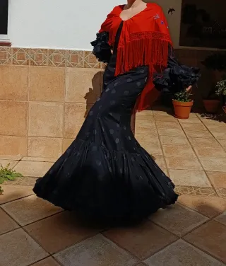 Traje de flamenca negro con lunar + mantoncillo rojo 💃 Traje de flamenca en color negro con lunares, muy elegante y fácil de combinar. El corte es entallado y estiliza mucho la figura, terminando en una falda con gran volante canastero que aporta mucho vuelo y movimiento. Las mangas llevan volantes negros con bastante volumen, que le dan un toque muy flamenco. Incluye mantoncillo rojo bordado con flecos, que contrasta precioso con el negro del traje y completa el conjunto. Usado solamente dos días
