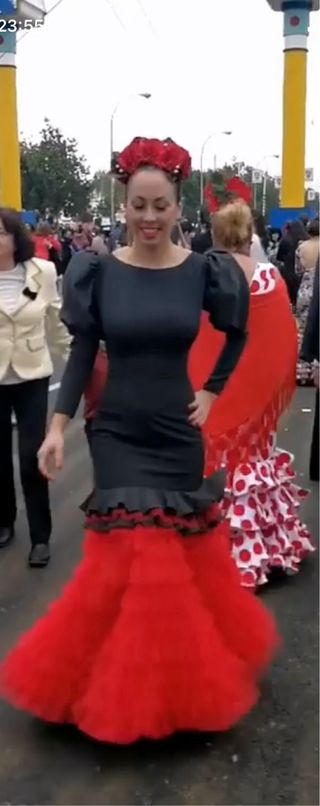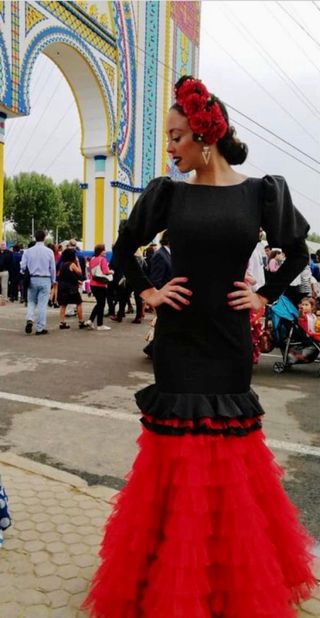 Traje de flamenca con un diseño llamativo. - Cuerpo con volantes rojos. - Falda larga con volantes negros. - es falda y body rojo de volantes - es talla unica la falda estira y el body tambien - es muy bonito y se complementa muy bien , le puedes meter otro body - lo he usado 2 veces nuevo - la falda me costo 40 y el body 25