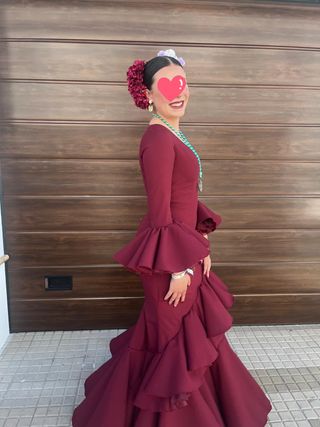 Traje de flamenca de color rojo, con volantes en mangas y falda. Puesto solo en dos ocasiones. Tiene bastante costura por su hace falta sacar.