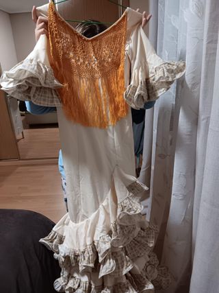 Traje de flamenca en color beige y color Camel , es súper bonito con varios volantes en la parte de abajo que suben en pico al vestido y los separa una cenefa como de encaje super bonita , más volantes en la manga .En la parte de atrás se cierra con una cremallera . Lo entrego con sus dos flores a juego y sus pendientes . Usado una sola vez .