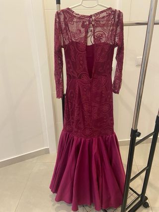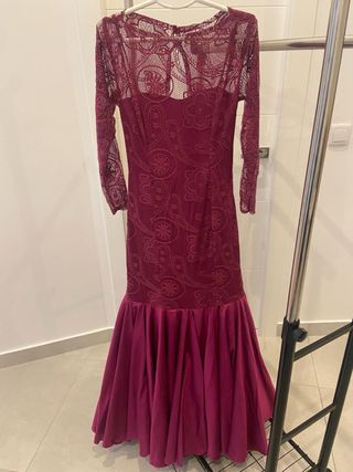 Elegante vestido de flamenca en color buganvilla. Diseñado con un cuerpo de encaje y una falda con vuelo. - Cuerpo de encaje con manga larga. - Falda con volantes. - Diseño tipo sirena. Pecho 90cm Cintura 70 cm Largo 1,45cm Largo de manga 55cm