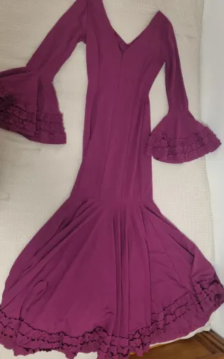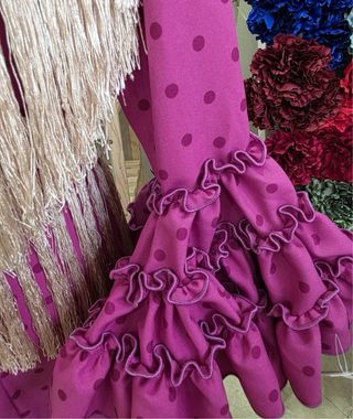 Vestido de flamenca elástico con un vibrante color morado. Su diseño es ideal para eventos y celebraciones. - Mangas acampanadas con volantes. - Falda con volantes en el bajo. - Tejido elástico para mayor comodidad.