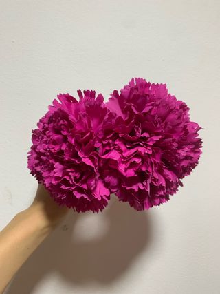 Dos grandes claveles buganvilla, perfectos para complementar tu traje de flamenca. - Diseño voluminoso y llamativo. - Color buganvilla - Tamaño cada uno: 11x11cm - Atrás con palito