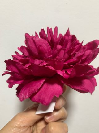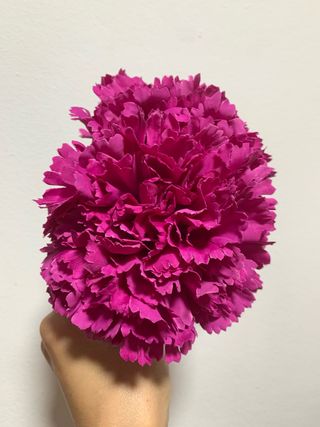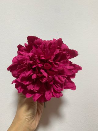 Flor artificial tipo peonia o dalia, ideal para trajes de flamenca. - Color buganvilla intenso. - Aspecto voluminoso y detallado. - Tamaño: 12x12cm - Atrás con palito