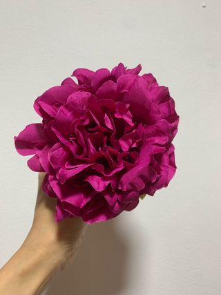 Flor de peonia grande, estilo flamenca, en un vibrante color buganvilla. Ideal para complementar trajes o decoraciones. - Diseño voluminoso y detallado. - Material de tela suave al tacto. - Tamaño: 12x12cm - Atrás con palito