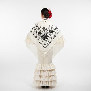 Manton de flamenca de color crema con un bonito bordado floral en negro. Ideal para completar tu traje de flamenca. - Diseño de flores negras. - Flecos largos.