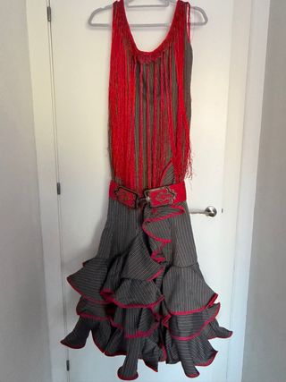 Traje de flamenca estilo rociero, con un diseño elegante y llamativo. Tiene margen como para sacar unos cm - Cuerpo ajustado con detalles de flecos rojos. - Falda larga con volantes y ribetes rojos. - Cinturón ancho rojo con hebilla decorativa.