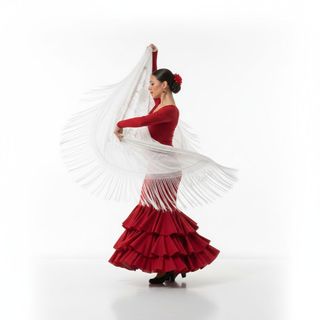 Vestido de flamenca con un diseño espectacular y un mantón a juego. - Vestido largo con múltiples volantes en cascada. - Mangas acampanadas con volantes. - Mantón con flecos y detalles bordados.