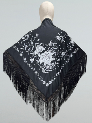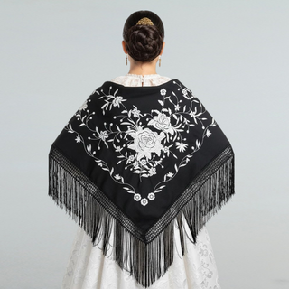 Elegante mantón de flamenco negro con un intrincado bordado floral en blanco. Un accesorio clásico para trajes de flamenca. - Diseño de flores blancas bordadas. - Flecos largos y abundantes. - Tejido negro de calidad.Mantón flamenco con los bordados, los flecos son mismo color mantón, en forma de triángulo, tamaño 150x70cm, y más 18cm de los flecos, nuevo sin estrenar #feriadeabril #ferias #flamenco #mantocillo #romería #complemento #manton #flamenca #mantonflamenca #mantonbordado #mantonferia #peinetas #pendientesmujer #accesorias #clavelesflamenca #ramilletes #acesorioscabello #floresflamenca #accesoriosflamenca #peinecillo #p
