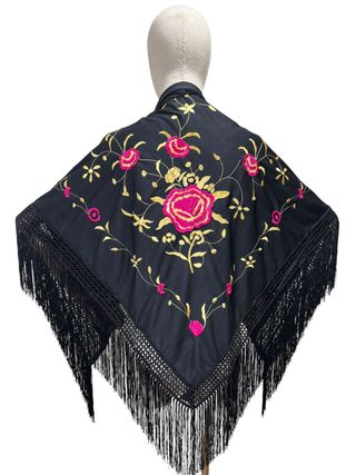 Manton de flamenca negro con preciosos bordados florales. - Diseño con flores en tonos fucsia y dorado. - Flecos negros en todo el contorno. - Ideal para trajes de flamenca. Mantón flamenco con los bordados, los flecos son mismo color mantón, en forma de triángulo, tamaño 150x70cm, y más 18cm de los flecos, nuevo sin estrenar #feriadeabril #ferias #flamenco #mantocillo #romería #complemento #manton #flamenca #mantonflamenca #mantonbordado #mantonferia #peinetas #pendientesmujer #accesorias #clavelesflamenca #ramilletes #acesorioscabello #floresflamenca #accesoriosflamenca #peinecillo #pendientesflamenca #pendientes #complementosf