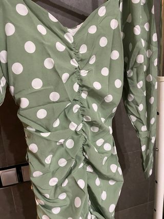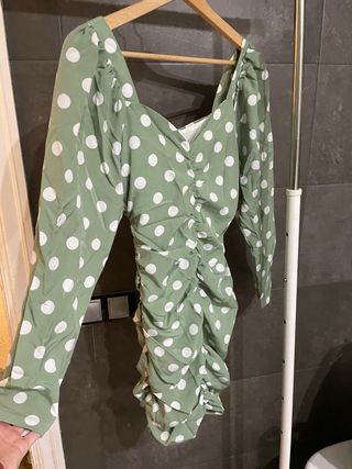 Vestido con un estampado de lunares. - Diseño con escote cuadrado. - Mangas largas abullonadas. - Detalle fruncido en la parte delantera. - Perfecto para ferias flamencas si no quieres ir con traje de flamenca