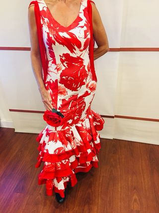 Traje de flamenca nuevo sin estrenar. Vestido confeccionado en tejido Stretch (incluye bolsillo). Talla 38/40, se le puede sacar. Medidas orientativas: - pecho: 93cm - cadera: 100cm - cintura: 74cm