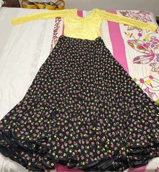 Conjunto de dos piezas para danza flamenca, compuesto por un body y una falda larga. - Body de manga larga en color amarillo. - Falda larga con estampado floral sobre fondo negro.