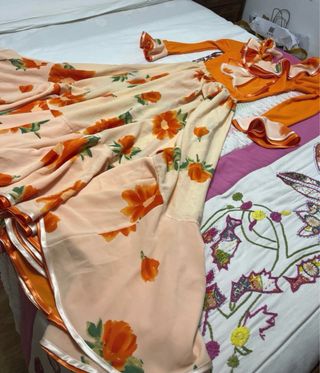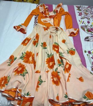 Vestido de flamenca con un estampado vibrante y detalles de volantes. - Diseño con estampado floral. - Mangas acampanadas con volantes. - Adornos de encaje naranja. - Falda con varios volantes y capas.