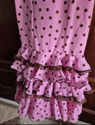 traje de flamenca de niña talla2. Tiene tela para sacar y meter. Rosa con lunares celestes