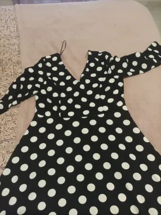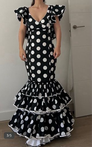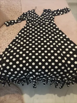 Traje de flamenca con estampado de lunares. Es una XL, da a una 44-46 perfectamente. Tela con licra. Una sola puesta - Diseño con escote en V. - Mangas largas. - Volantes en el bajo.