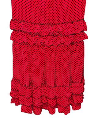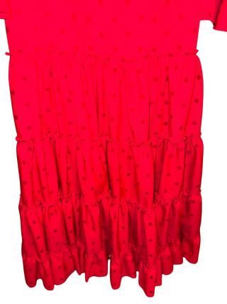 Vestido de flamenca con un diseño vibrante y alegre, perfecto para celebraciones. - Cuerpo rojo con escote en V y mangas abullonadas. - Falda con volantes escalonados. - Detalle de lunares blancos sobre fondo rojo en los volantes inferiores.