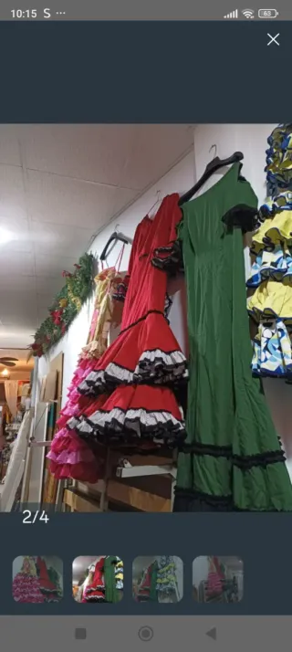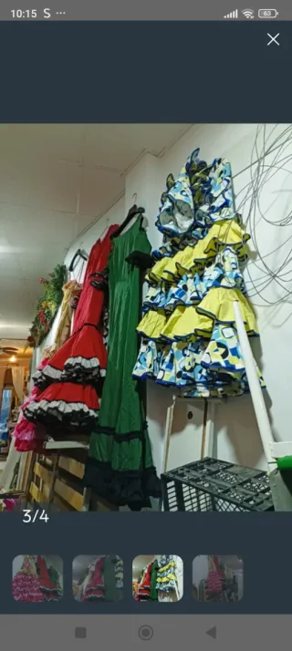 Conjunto de trajes de flamenca con un diseño vibrante y volantes. - Diseño multicolor con detalles en amarillo y rojo. - Un traje largo verde con volantes negros. - Talla única. Escucho ofertas
