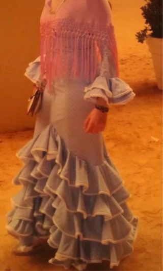 Vendo Traje de Flamenca celeste con lunares blancos, es precioso y apenas ha tenido uso (dos veces me lo he puesto) Hecho a mano y con un pequeño bolsillo interior para guardar las pertenencias. Es una talla S/M. MEDIDAS: El total del alto es de 1,40m De caderas 94cm De pecho una 82/84 Y de cintura 72 cm. Mido 1,60 y peso 55 kilos (por si sirve de referencia).