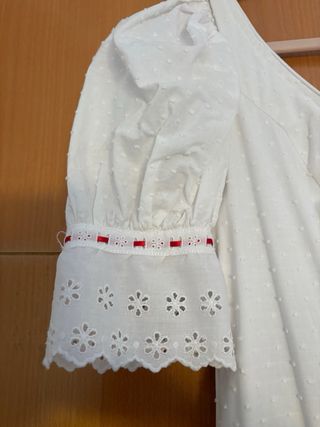 - Largo del vestido 1,40cm con posibilidad de bajarle 5cm o viceversa. - Adornos de encaje blanco en mangas, escote y volantes.
