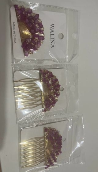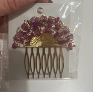 Peineta de estilo abanico, adornada con piedras moradas y detalles dorados. Perfecta para trajes de flamenca o eventos especiales. - Diseño en forma de abanico. - Adorno de piedras moradas. - Base metálica dorada. 2 peinetas mas in broche