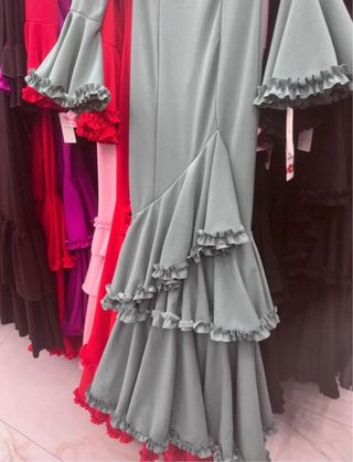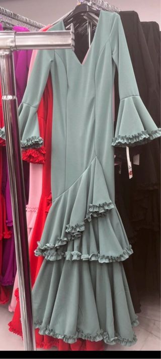 Traje de flamenca de color verde sabia, con un diseño elegante y detalles que lo hacen único. - Mangas largas acampanadas con volantes. - Cuerpo entallado. - Falda con volantes escalonados y asimétricos. - Adornos de volantes en puños y falda.