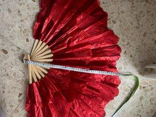 Abanico de tela roja con varillas de madera, ideal para flamenco, danza, teatro o carnaval. Su diseño llamativo y su tamaño lo hacen perfecto para cualquier actuación. - Material: Tela y madera. - Color: Rojo vibrante. - Estilo: Flamenco/Danza. - Uso: Baile, teatro, carnaval, eventos.