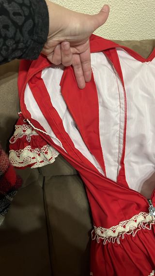 Precioso traje de flamenca, ideal para cualquier evento. Es rojo y tiene lunares rojos volantes blanco 45cintura 35pecho 135largo - Diseño elegante y favorecedor. - dos volantes. - Confeccionado con tejido de buena calidad. - Perfecto estado.