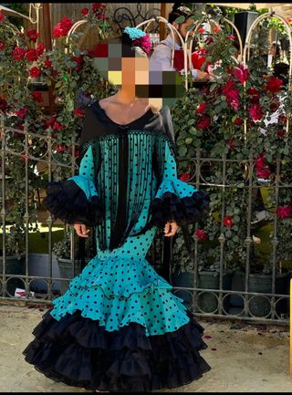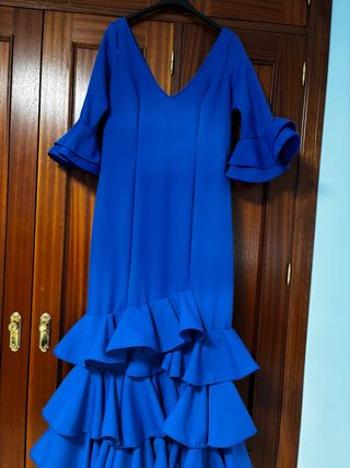 Elegante traje de flamenca de color azul, con un diseño que evoca el estilo tradicional andaluz. - Mangas largas con volantes acampanados. - Falda con múltiples volantes escalonados. - Corte ceñido que realza la figura. La talla da de una 36 a una 42, es elástico y no transparenta
