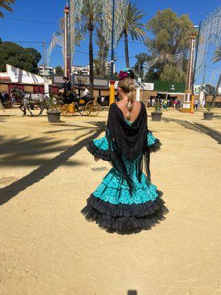 Traje de flamenca azulina con lunar beige. Tiene bolsillos interior en volante. Talla 38., 147cm largo. Trae para sacar en costados por si es necesario. Manton no incluido.
