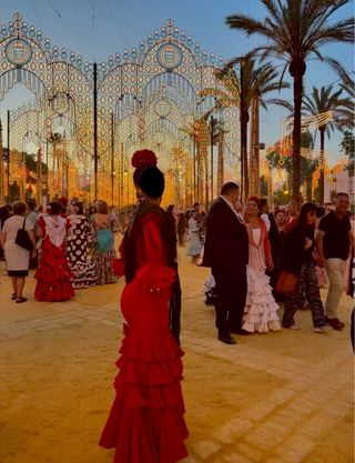 Es un traje de flamenca hecho a medida. Sería una talla 40-42, con posibilidad de ampliar a una talla más. • Color: rojo intenso con lunares blancos pequeños. • Corte: entallado hasta la cadera, realzando la figura, y a partir de ahí se abre con volantes en cascada. • En la falda, varios volantes superpuestos que aportan mucho movimiento y volumen. • En las mangas, volantes amplios a la altura del codo. En la enagua tiene un bolsillo para llevar todo lo necesario (llaves, monedero, barra labios…) Es un traje muy flamenco, femenino y tradicional, ideal para feria, El Rocío... con un aire clásico y elegante Costo mas de 400€