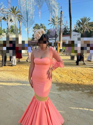 Traje de flamenca con un diseño elegante y llamativo. •De talla da desde una M hasta una L - Color coral con detalles dorados. - Manga con encaje. - Falda con volantes caída sencilla - Escote en palabra de honor •Cualquier información no dudes en preguntar!