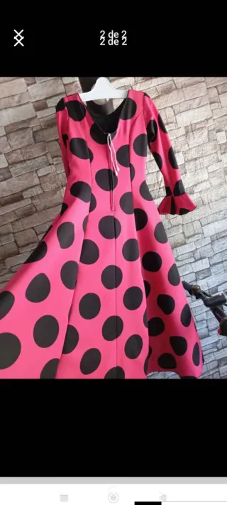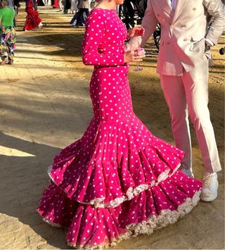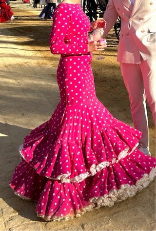 Vestido de flamenca con un solo uso, en perfecto estado. Un diseño vibrante y elegante. - Diseño de lunares blancos sobre fondo fucsia. - Volantes en cascada en la falda. - Mangas largas. Precio negociable