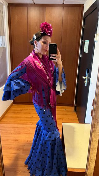 Traje de flamenca azul con lunares negros.