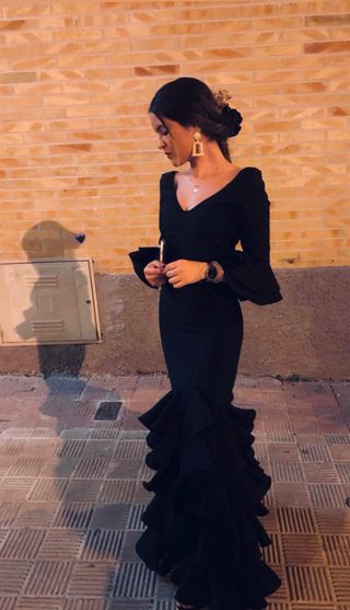 Elegante traje de flamenca en color negro, hecho de licra comodo, ajustado al cuerpo por lo que es facil de llevar. El diseño es entallado y terminado en volantes, aportando movimiento y elegancia al andar. - Mangas acampanadas con volantes. - Falda con múltiples volantes. - Escote en V.