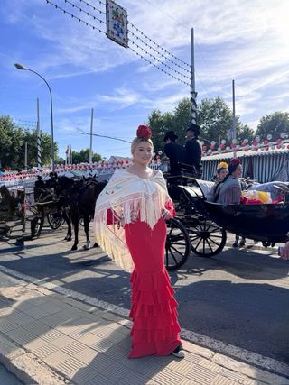 Traje de flamenca rojo vibrante, ideal para ferias y celebraciones. - Vestido con volantes. - Mangas acampanadas.