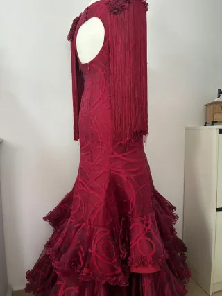 Vendo traje de flamenca. Se encuentra en perfecto estado. La tela es de cachimira. Talla 40. Tiene las costuras para poderle hechar. Confeccionado a medida. Tiene los flecos puesto pero se podrian quitar.