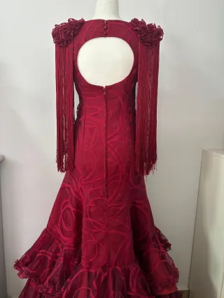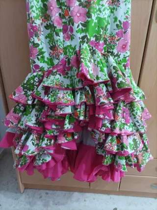 Vendo traje de flamenca, usado en tres ocasiones.La espalda es en forma de triangulo adjunto foto. Tela en perfecto estado, esta como nuevo. Confeccionado a mano y tiene costuras para poderle hechar. Talla 38/40. Regalo flores y pendientes.