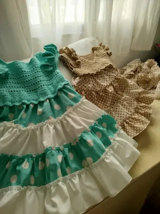 Conjunto de trajes de flamenca y ropa de ganchillo, elaborados a mano con esmero. - Diseño con volantes y lunares. - Parte superior de ganchillo. - Colores disponibles: beige y turquesa.