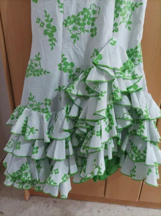 Traje de flamenca de popelín talla 40 El pañuelo de flecos verde de crespon con el borde en forma de ola tambien nuevo, no está incluido en el precio, lo vendo aparte a 12 €.