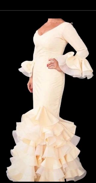 Elegante traje de flamenca en color beige crudo. Diseñado con volantes en la falda y mangas acampanadas. - Mangas largas con volantes. - Falda con múltiples volantes. - Diseño de corte sirena.