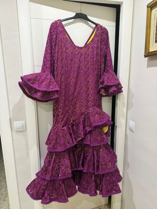 Traje de flamenca con un diseño espectacular y volantes. - Tejido de encaje morado con detalles dorados. - Mangas acampanadas con volantes. - Múltiples volantes en la falda.