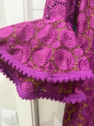 Está arrugado porque estaba guardado pero se plancha muy bien! Es una talla 42 pero está ajustado a mi cuerpo, de todas formas tiene para sacarle por la parte de la cintura y de largo Medidas: Pecho 48 Cintura 36 (por un lado) 72 en total Cadera 52 (por un lado) 104 en total Altura: yo mido 1,57 pero tiene mucha tela para sacarle de largo (hasta 10cm) Tiene bolsillo bajo los volantes Muy cómodo, no pesa Tela no elástica Vestido valorado en 200€